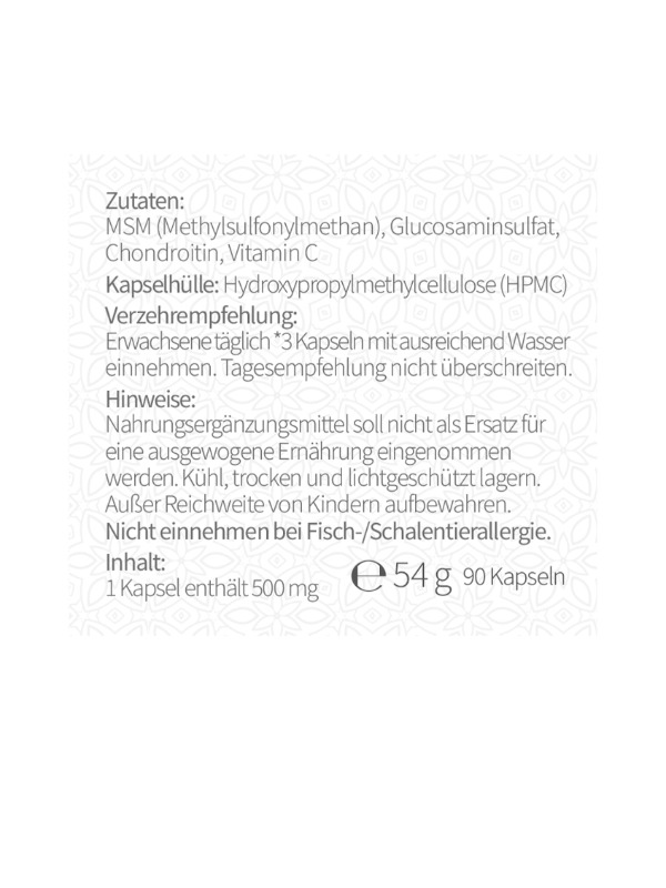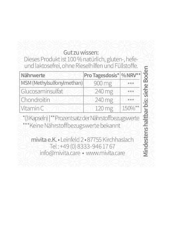 Zutaten:  MSM (Methylsulfonylmethan), Glucosamin, Chonodroitinsulfat, Vitamin C